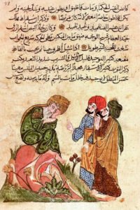তিন চিকিৎসক ঔষধ প্রস্তুত করছেন — ডায়স্কোরাইডিসের মাতেরিয়া মেডিকা’র আরবি অনুবাদ থেকে, ১২২৪, আবদুল্লাহ ইব্‌ন আল-ফাদল, ইরাক।
